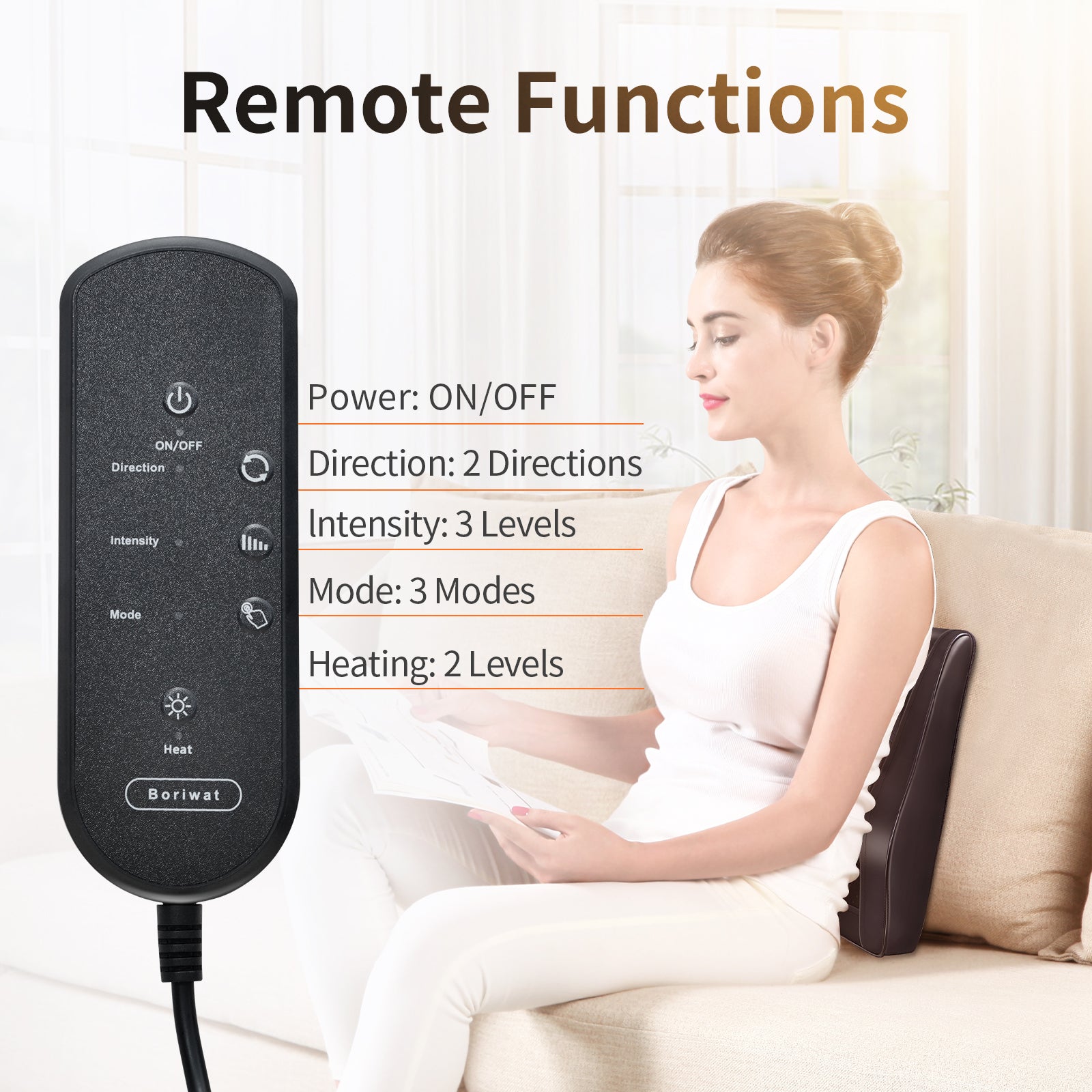 Neck and Back Massager for Pain Relief: Larger size: 15*13 inches, 6 inches longer than ordinary massage pillows. Perfectly fits the neck and back curves to provide you soothing & comfortable massage experience. 2 heating positions with 2 heating levels. 3 adjustable intensities.